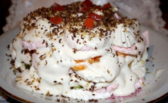 - Взбейте сливки или крем с холодным молоком и промажьте каждый слой, пока не исчерпаете зефир. Чем тоньше ингредиенты, тем нежнее будет вкус торта.