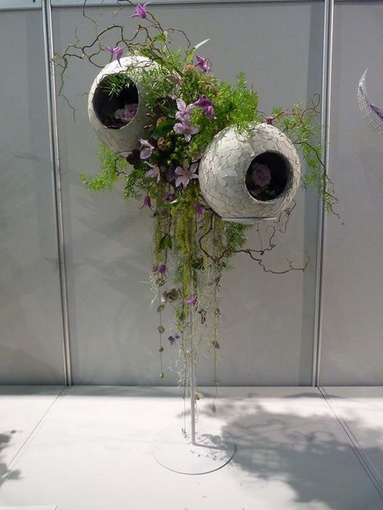 Для низко стоящих аранжировок лучше использовать прямостоячие цветы и ветки, загнутые вверх.