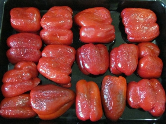 - Остужаем запеченные перцы и снимаем шкурку.