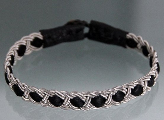 Возьмите черный шнурок средней толщины и четыре тонких серебристых. Длина черного шнурка должна обеспечивать удобную посадку на запястье, не спадать и не сжимать его.