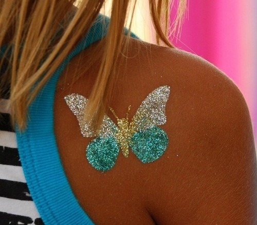 Данный вид временного тату получается красочным. Используется в этом случае специальный разноцветный клей. Он наносится на выбранное место тоненькой кисточкой. После нанесения тату эффект присыпается закрепителем.